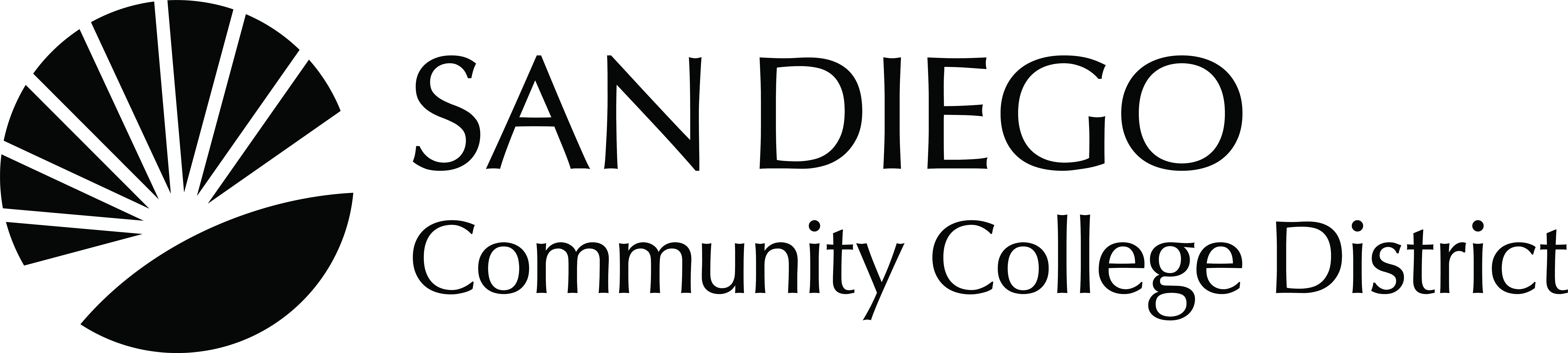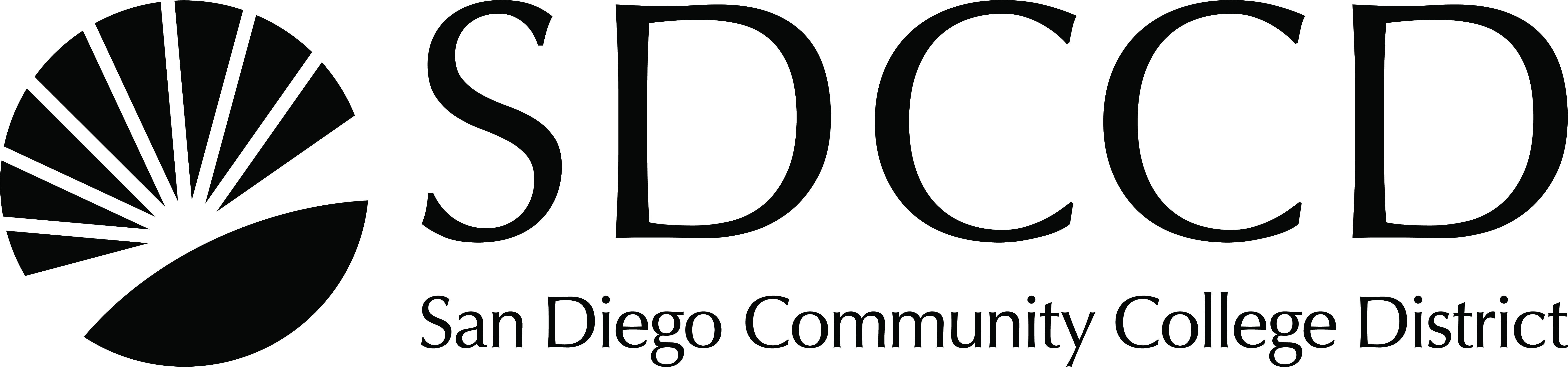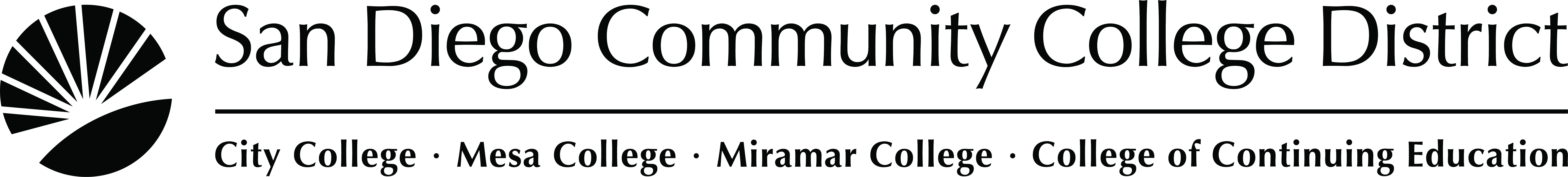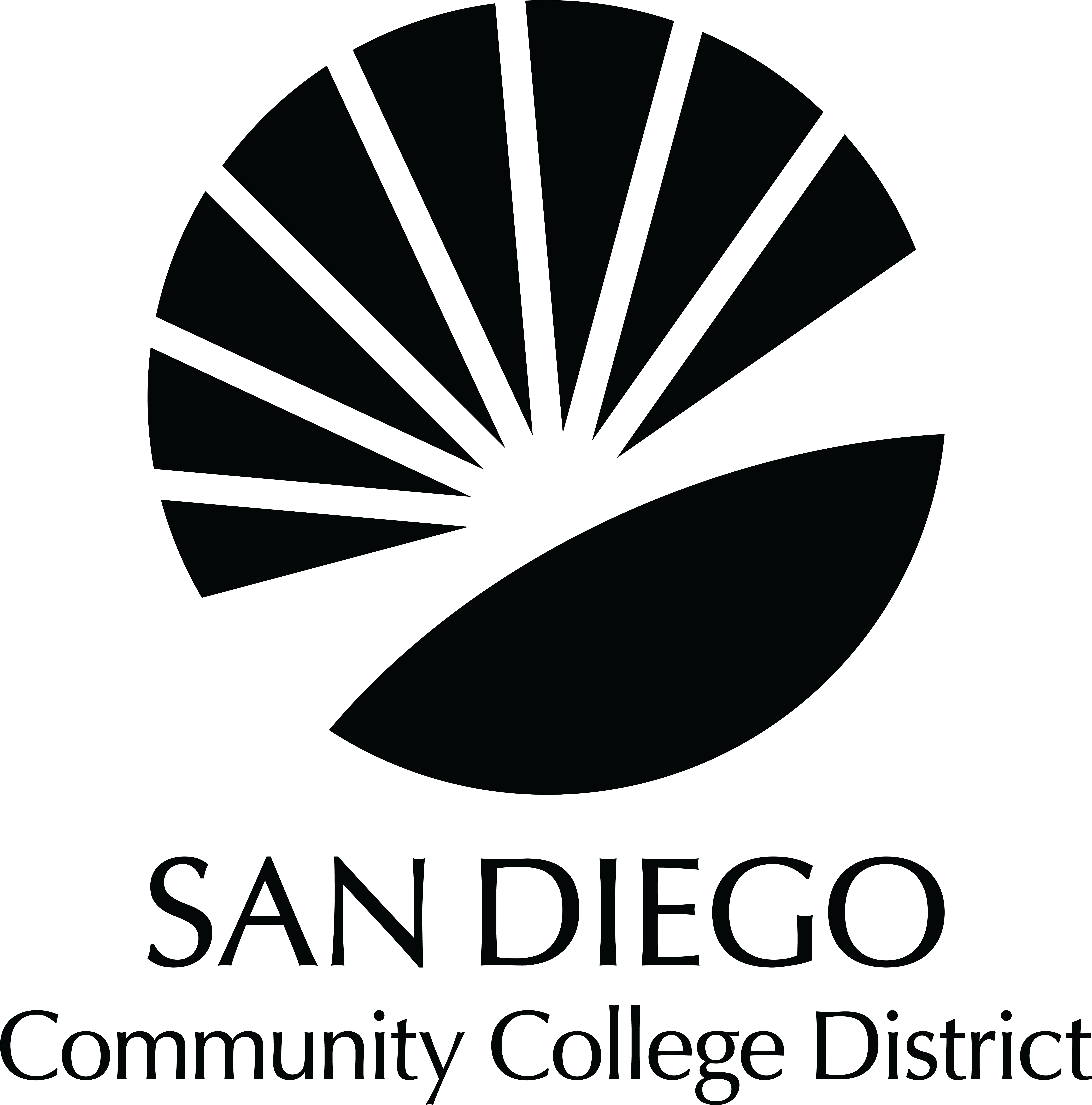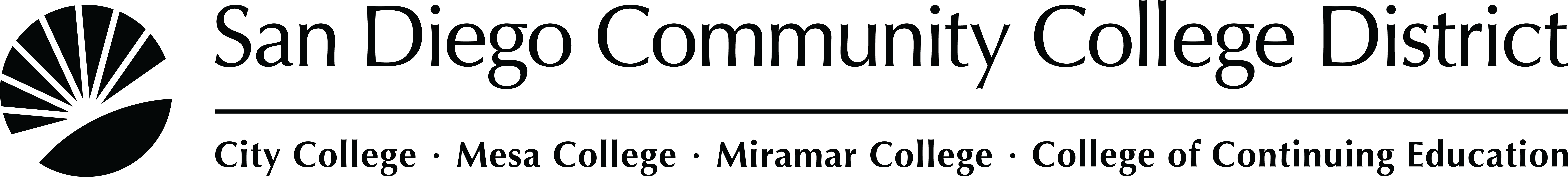 Sunburst logo with college colors and San Diego Community College District text at right and colleges below District text