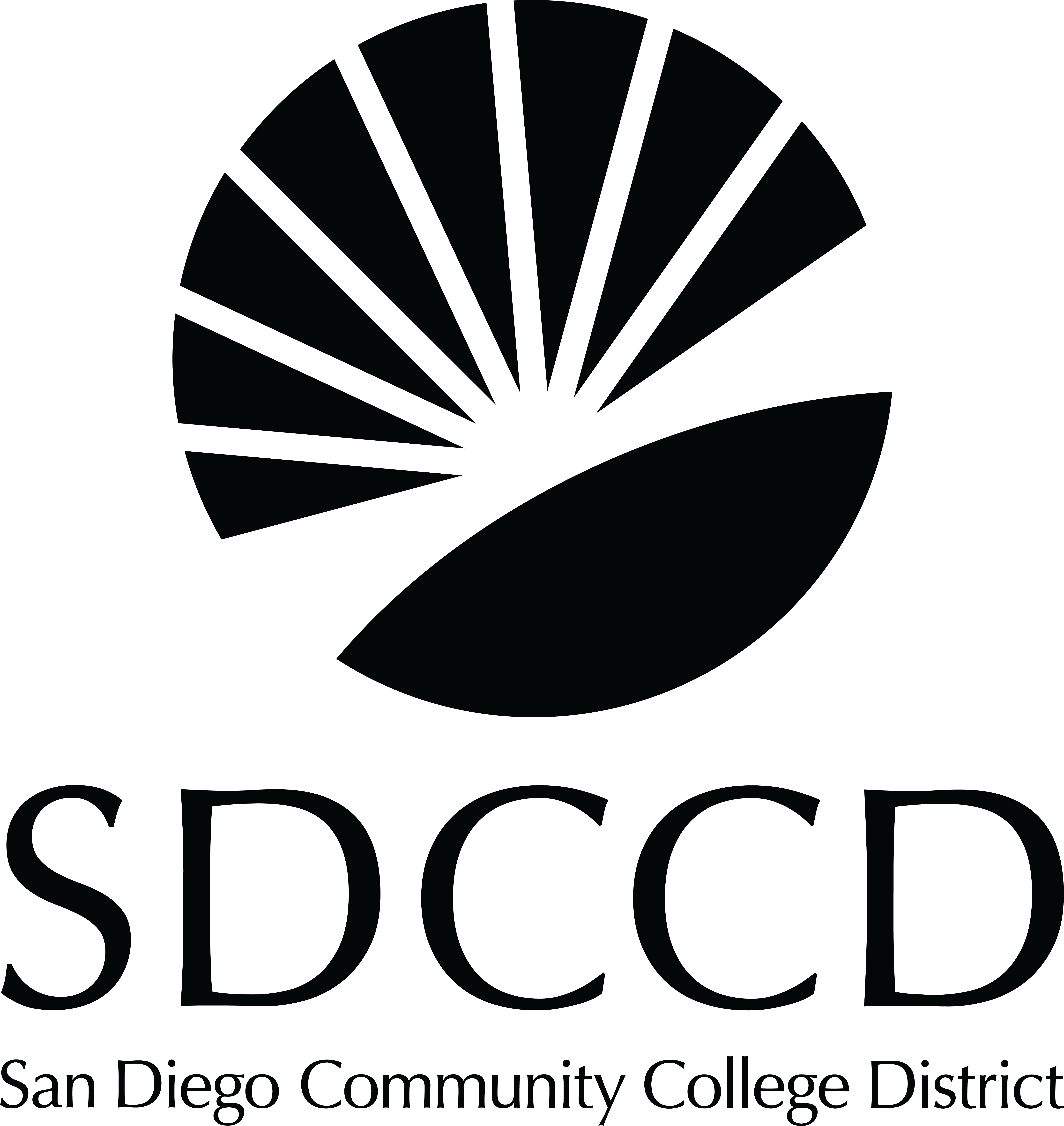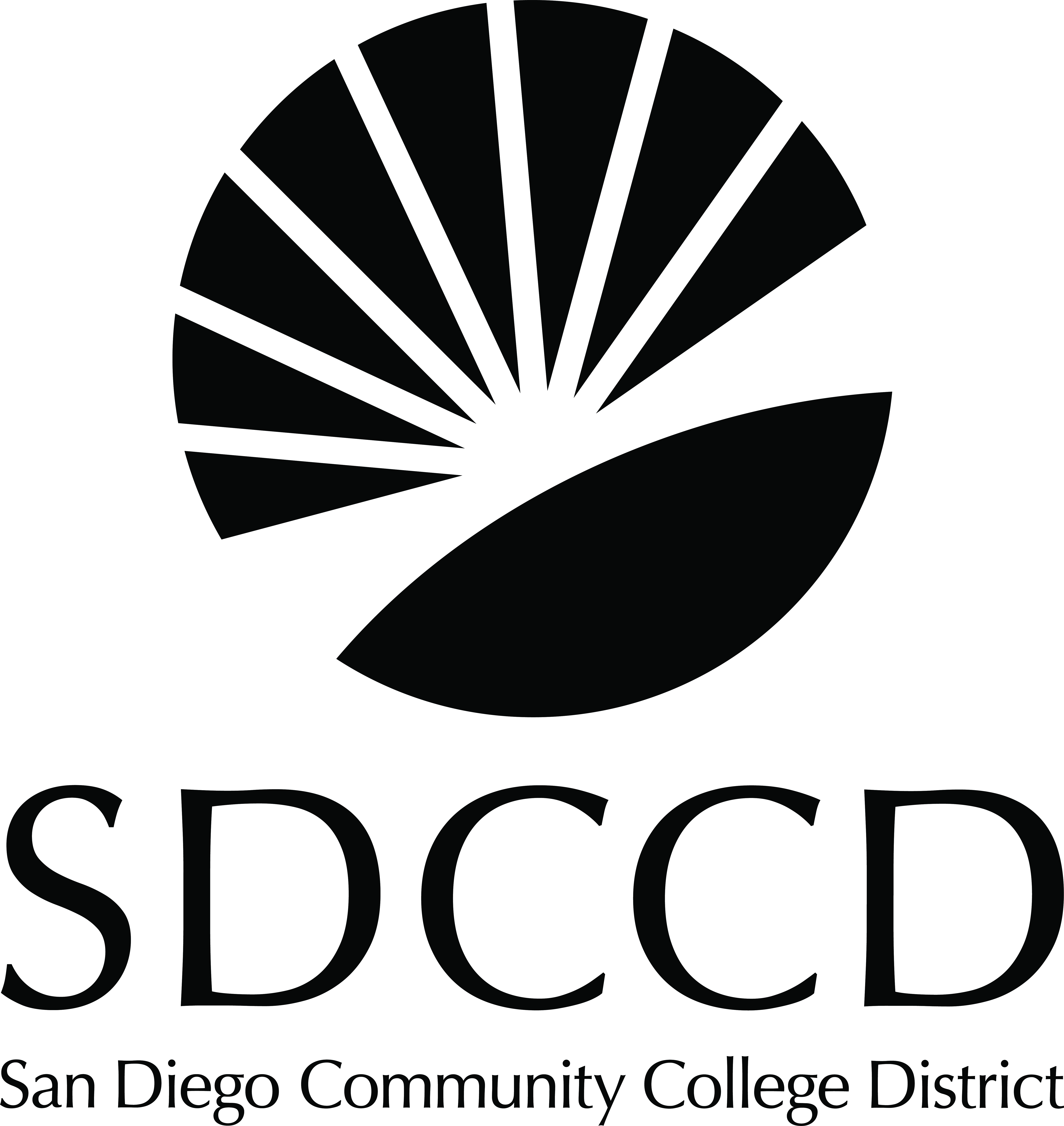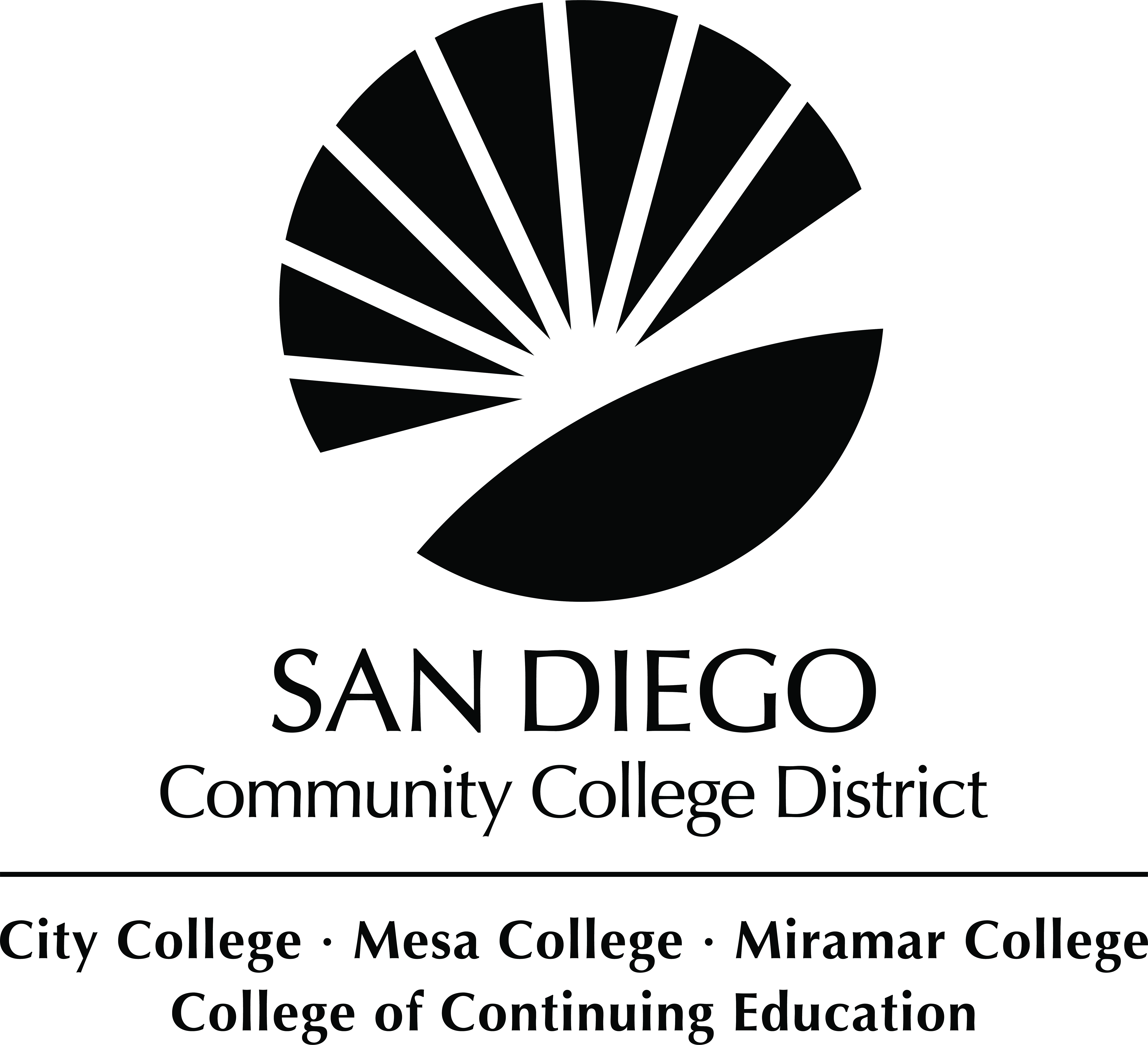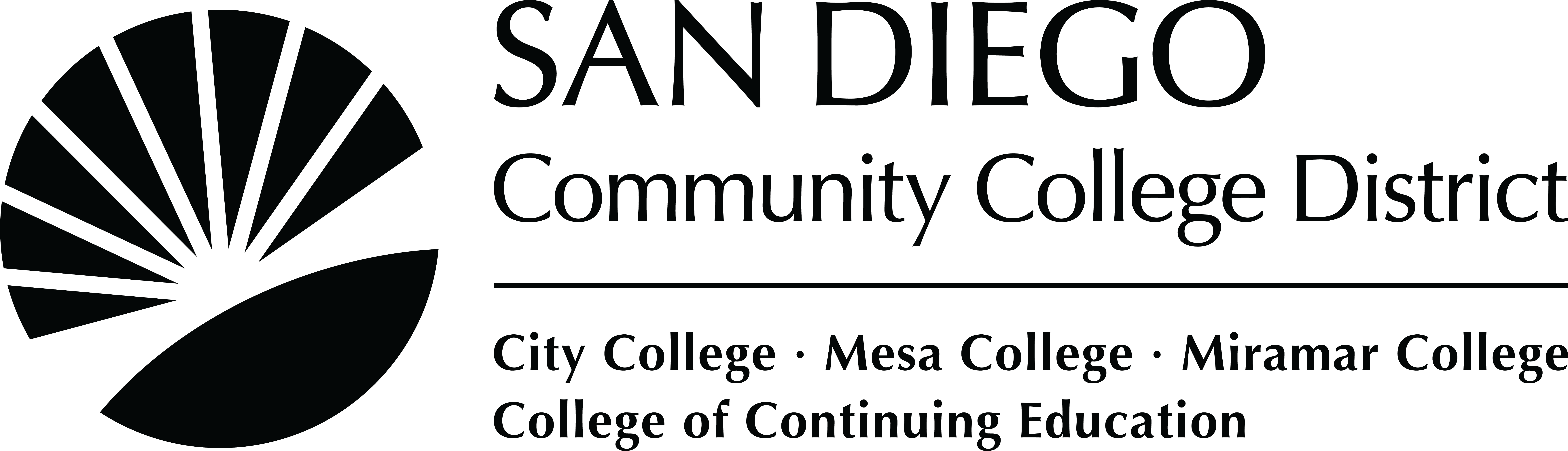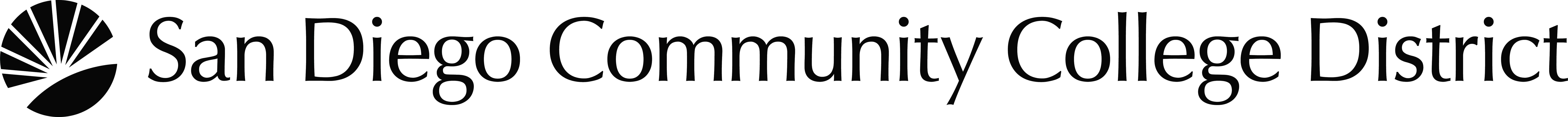Sunburst logo with college colors and San Diego Community College District text at right and colleges below District text