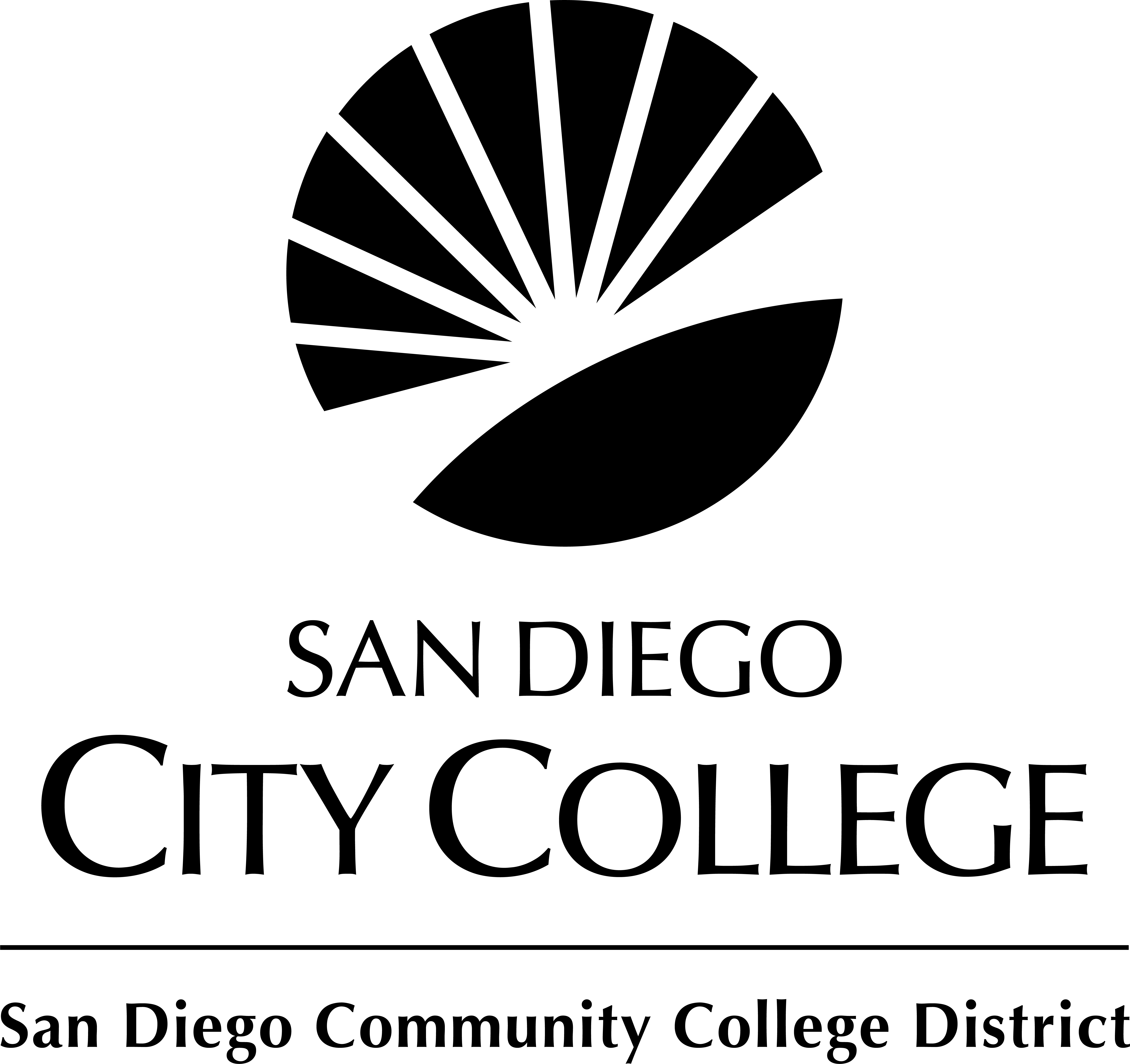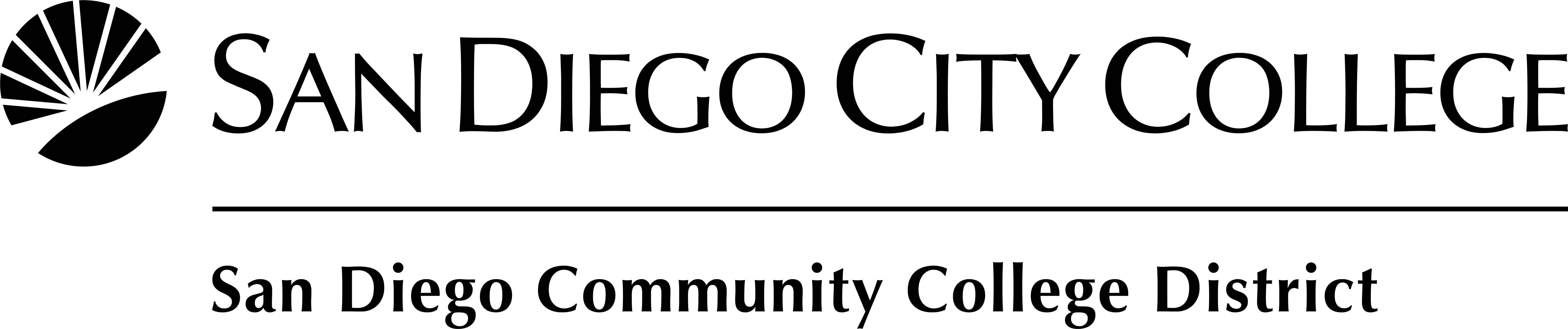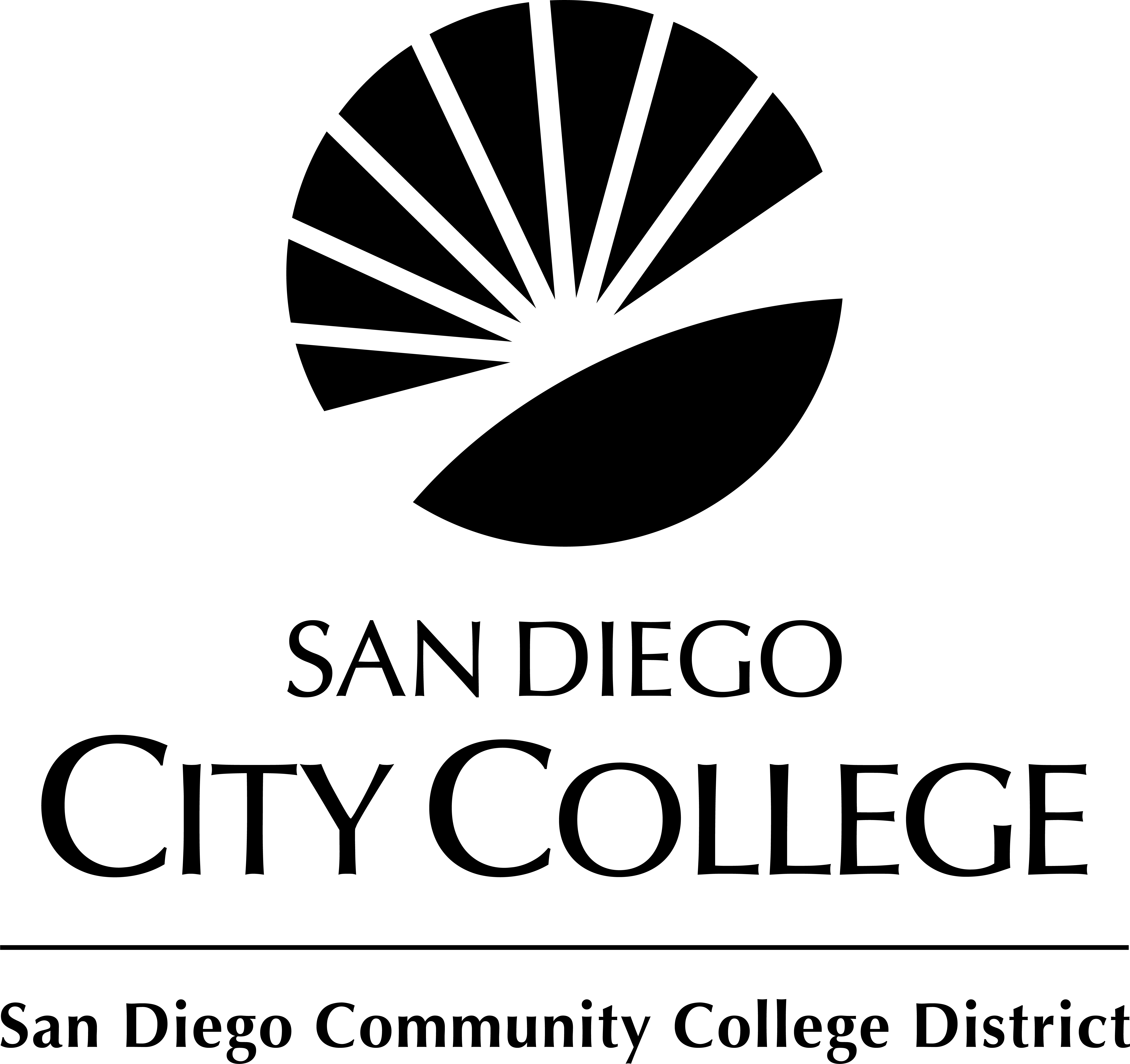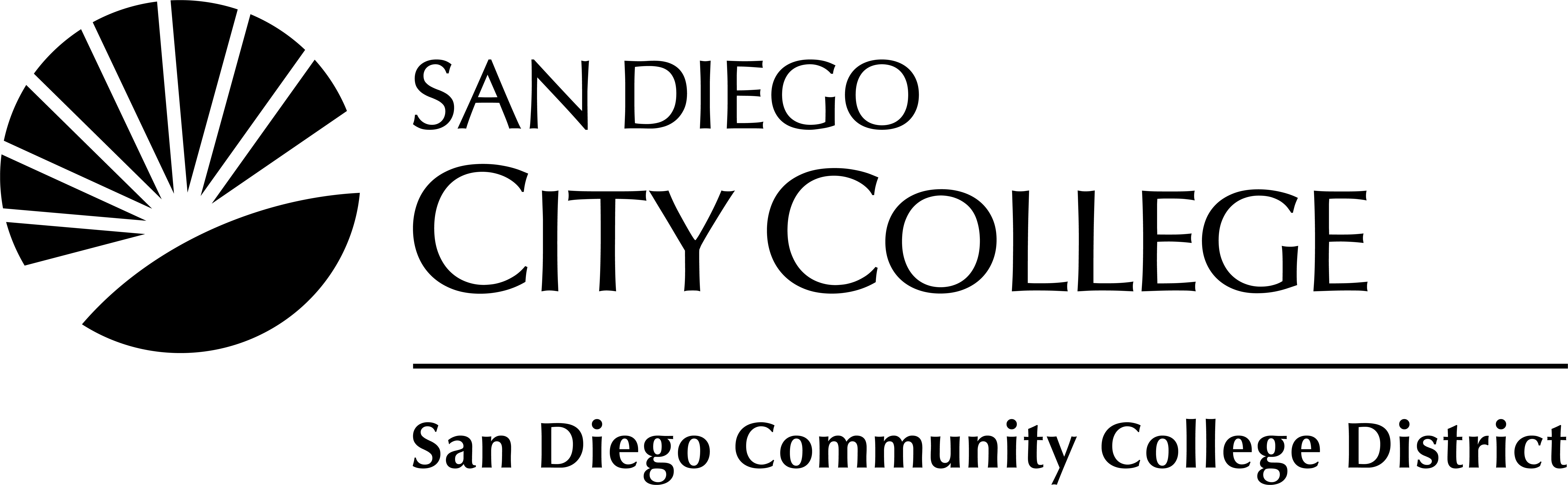 Sunburst logo with college colors and San Diego Community College District text at right and colleges below District text